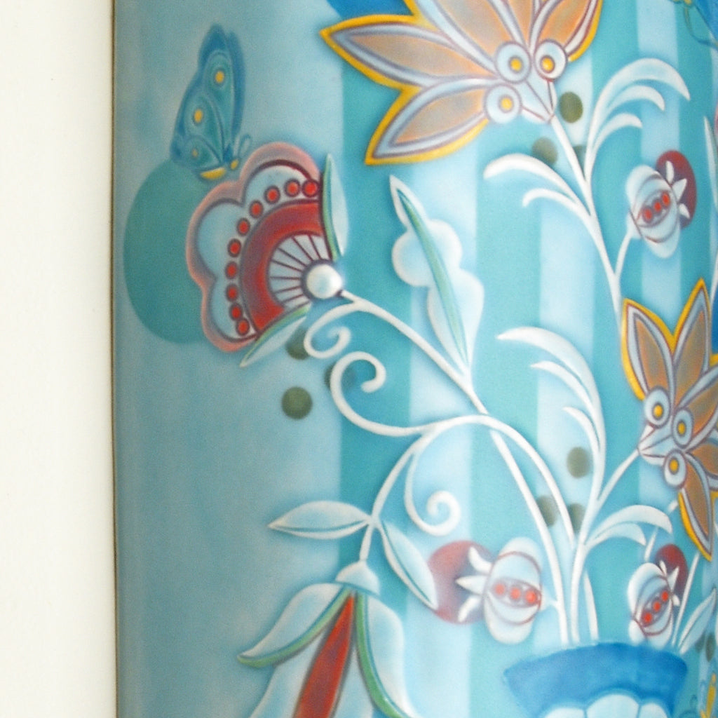Glazed in a satin light turquoise w. detail in multi-colored detail featuring a vase of flowers and butterflies.